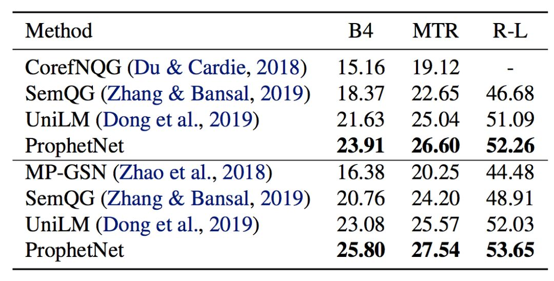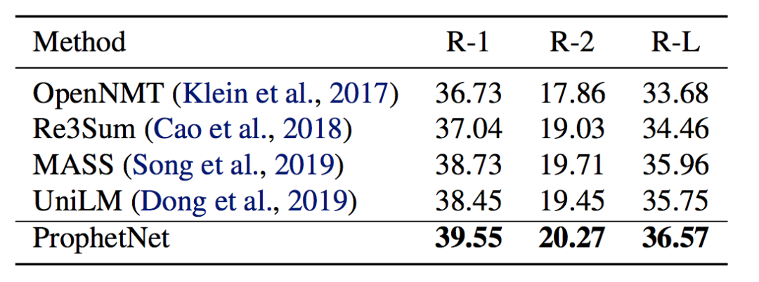 我们使用两个规模的语料数据训练 ProphetNet。ProphetNet 包含12层的 encoder 和12层的 decoder,隐层大小为1024。先在 BERT 所使用的 BookCorpus+Wikipedia(16GB)的数据上预训练模型,将模型在 Text summarization 和 Question generation 两个 NLG 任务上的三个数据集微调并评估模型性能。与使用同等规模数据(16GB)的预训练模型相比,ProphetNet 在CNN/DailyMail、Gigaword 和 SQuAD 1.1 question generation 数据集上都取得了最高的性能,如表1-3所示。