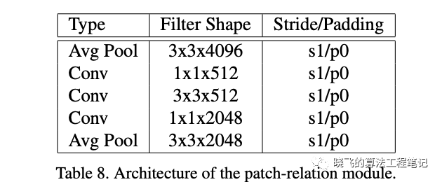 patch-relation head,用于学习非线性的块匹配,即一对多的关系。将和concatenate成特征,然后输出到表8的块关系模块中,表8的卷积层后面都接ReLU,所有卷积层和池化层都进行0填充,模块将特征图从下采样为(这里池化层的s1/p0感觉描述不清楚,等源码放出来再看看),最后同时接两个全连接层,一个全连接产生匹配分数,另外一个产生bbox的预测