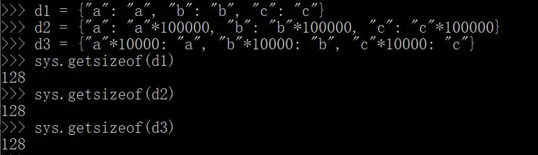 明显可以看出,三个字典实际占用的全部内存不可能相等,但是 getsizeof() 方法给出的结果却相同,这意味着它只关心键的数量,而不关心实际的键值对是什么内容,情况跟列表相似。