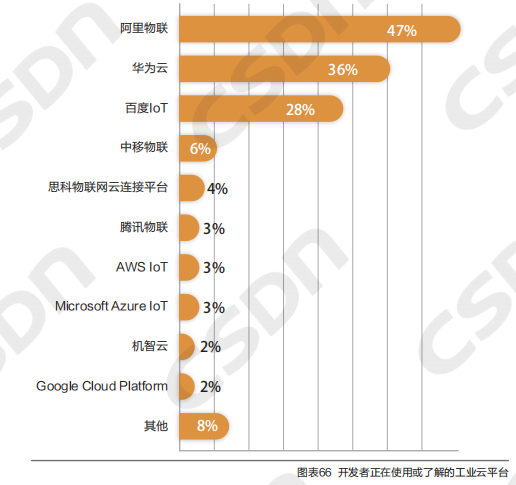 Linux 和 Windows 是较普遍的操作系统,使用率分别为 51%、44%。目前在物联网设备开发过程中,Linux、Windows 和 Android 较为普遍,依然延续了 PC 平台的开发者操作系统份额。虽然华为、阿里等公司在 2019 年均发布了自己的物联网专用操作系统,但还并未得到开发者的大规模认可,大公司的物联网操作系统发展之路依然任重而道远。