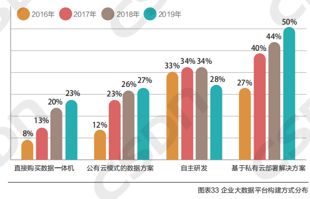 随着分布式计算和云平台的逐步成熟,目前大部分公司都有能力搭建自己的大数据平台。调研数据显示,81% 企业在进行大数据相关的开发和应用,50% 的企业选择私有云解决方案来部署大数据应用,28% 的企业选择自主研发。