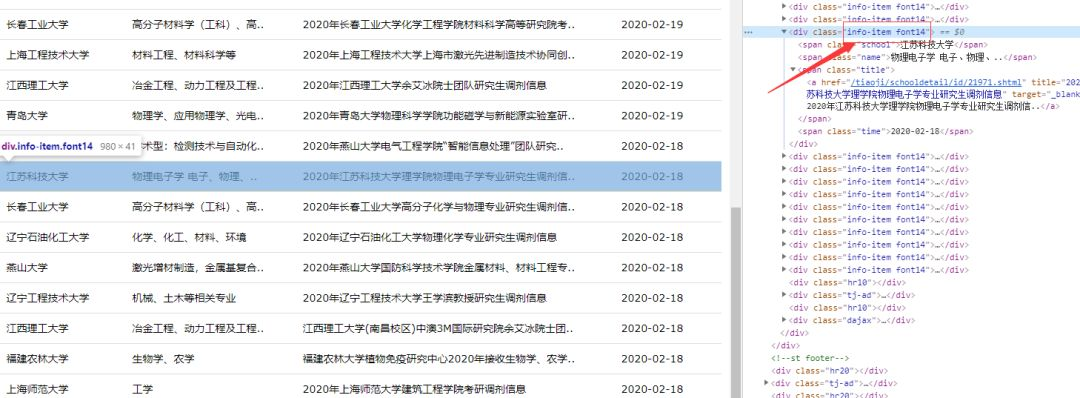 可以看到页面的排版如上,所需要的调剂内容就是图中红框标识出来的,这里对页面进行HTML解析,发现红框的HTML标签为DIV,class=”student-body font14” 。