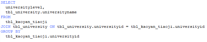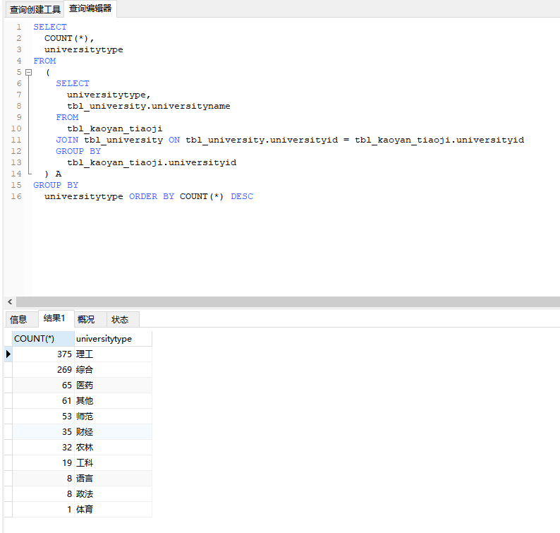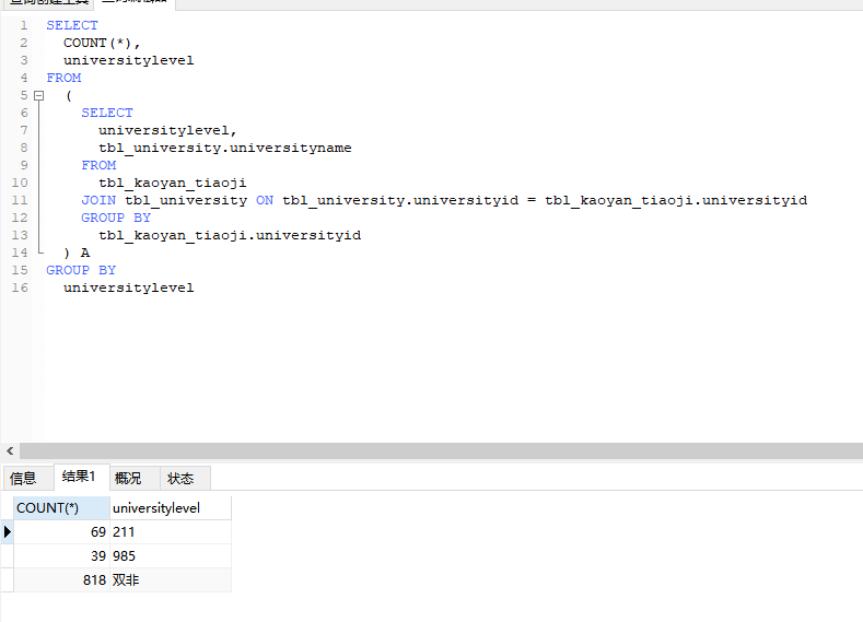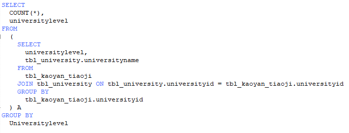之后,为了方便统计高校的层次分布,在外部再套上一层GROUP BY语句进行分类: