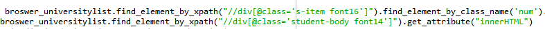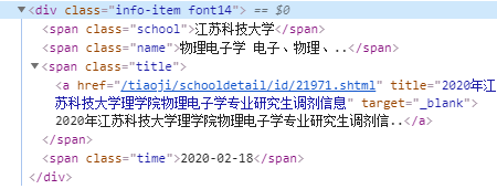 可以看到信息流的子项如下图所示,这个时候,可以根据class=”school” 抓取大学名称,根据class=”name”抓取专业名称 ,根据class=”title”抓取超链接和标题,根据class=”time”抓取发布日期。