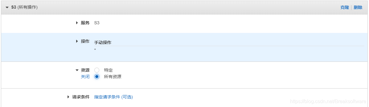 为了简单起见,我们让该策略拥有所有S3的所有资源和权限。(实际使用时,要做好权限管理,不要这么粗放)