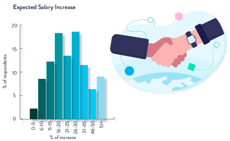 问卷中有一题:“如果你正准备跳槽,你认为加薪的百分比是现实的吗?” 18%的大多数人期望薪水增加26-30%,另外18%的人期望薪水增长在16-20%之间。