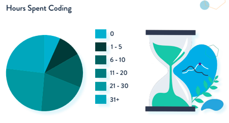 25%的受访者每周花费21-30个小时进行编程,这比我们2019年的调查结果增加了1%。22%的受访者表示,他们每周花费31个小时以上进行编程,而6%的人根本不会编程。总体而言,答案是多种多样的,这可能表明参与者的资历存在差异。
