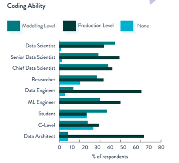 数据科学家主要将其能力描述为处于生产水平(58%),与我们2019年报告相比,增长了18%。C-Suite专业人员的能力特征是更倾向于生产水平(58%)。