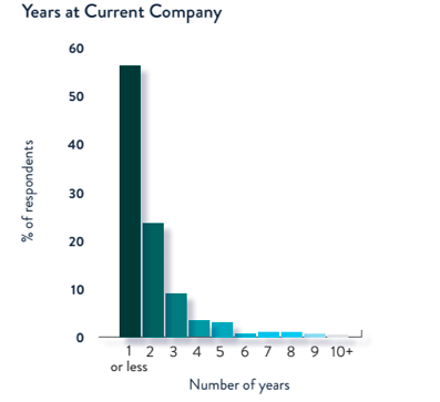 56%的受访者在公司任职一年或更短时间,比去年增加了10%。员工似乎正在积极寻求与行业快速增长保持一致的新机会。公司开始了解市场上人才的真实水平,他们比以往任何时候都更愿意提供更具竞争力的薪水来激励员工跳槽到新单位。