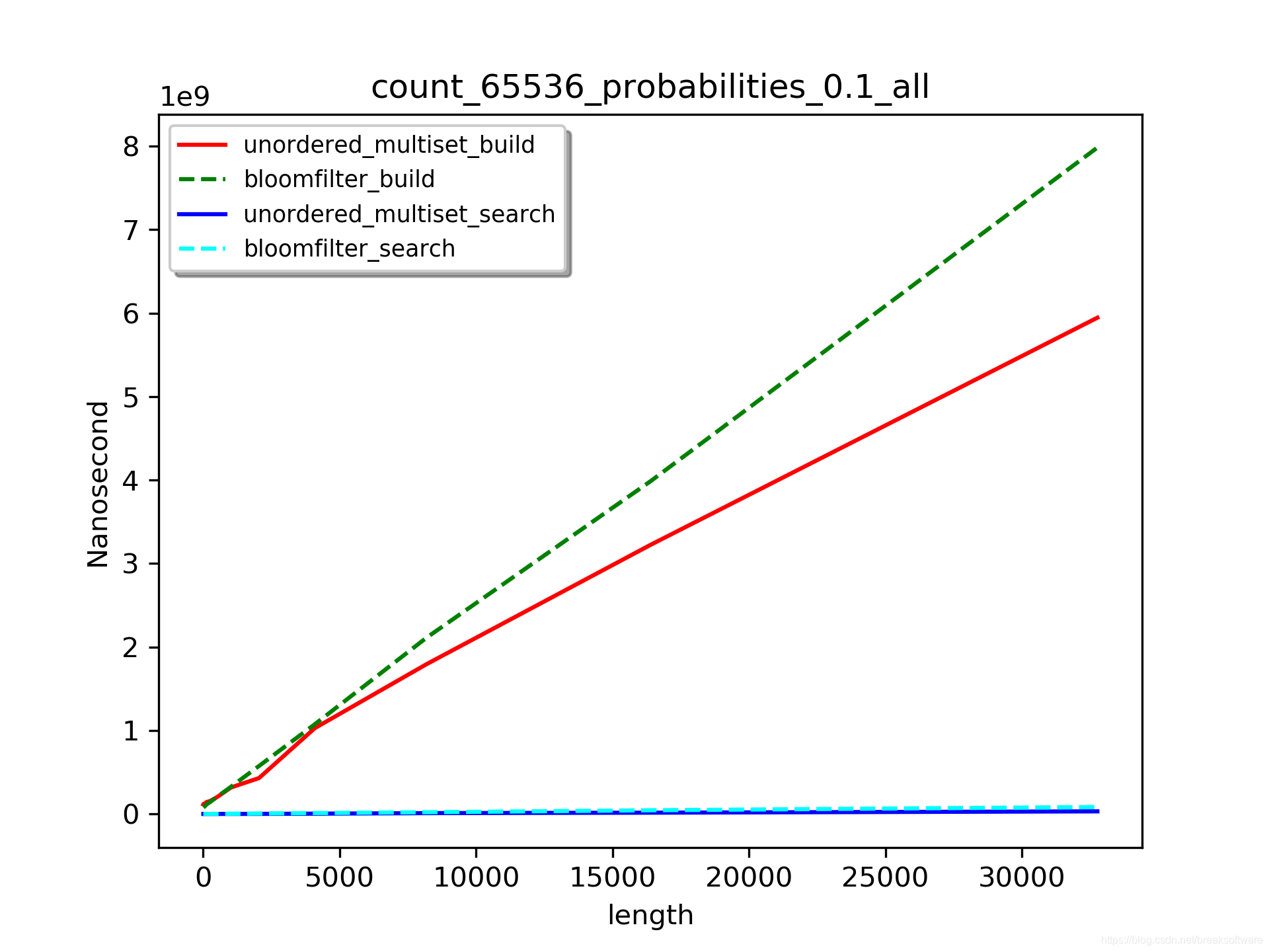 在集合大小(65536)和误算率(0.1)确定的情况下,我们比较不同数据长度下,unordered_multiset、bloomfilter的构建,和它们查找1024个不存在的元素的时间消耗。