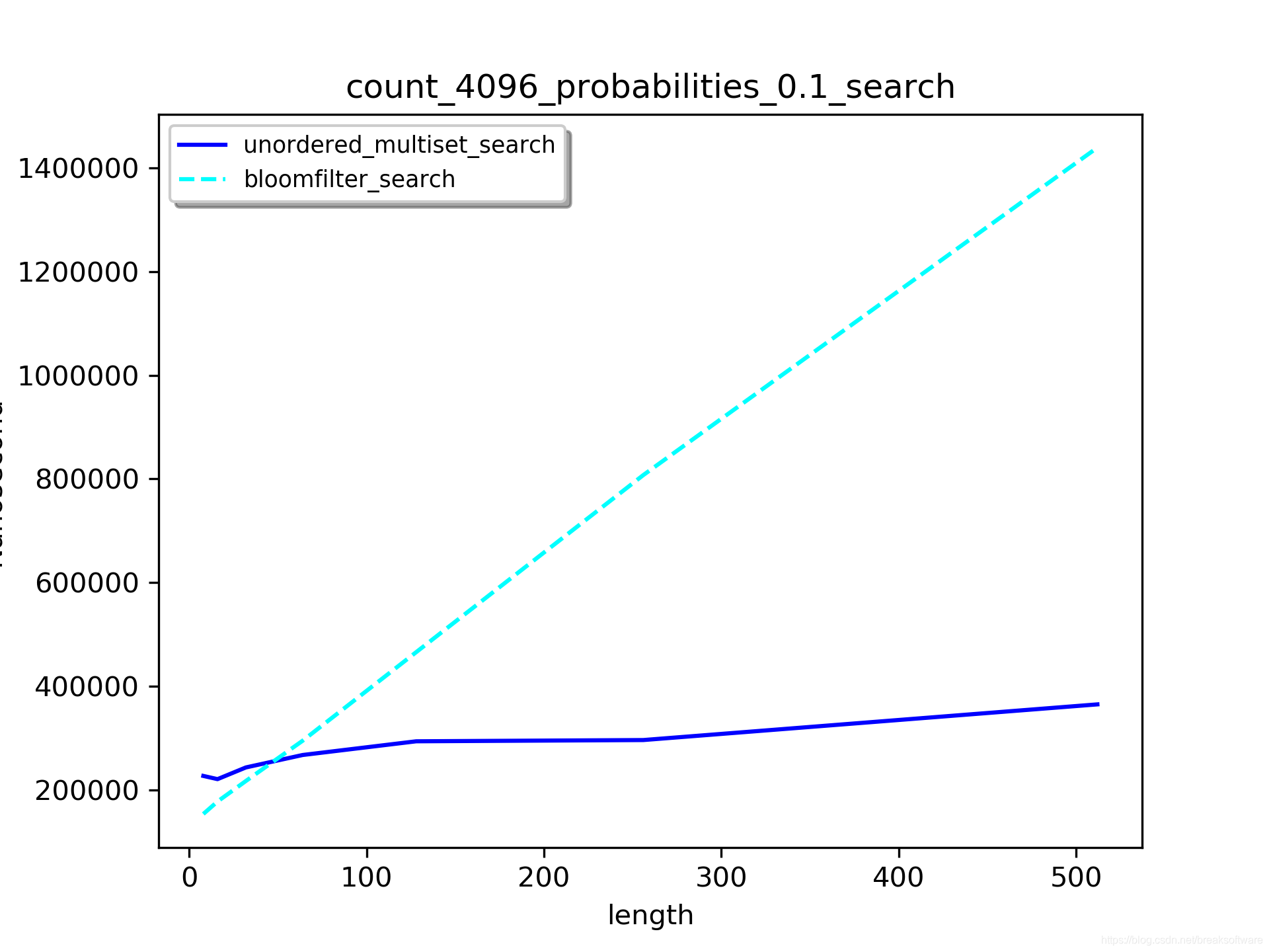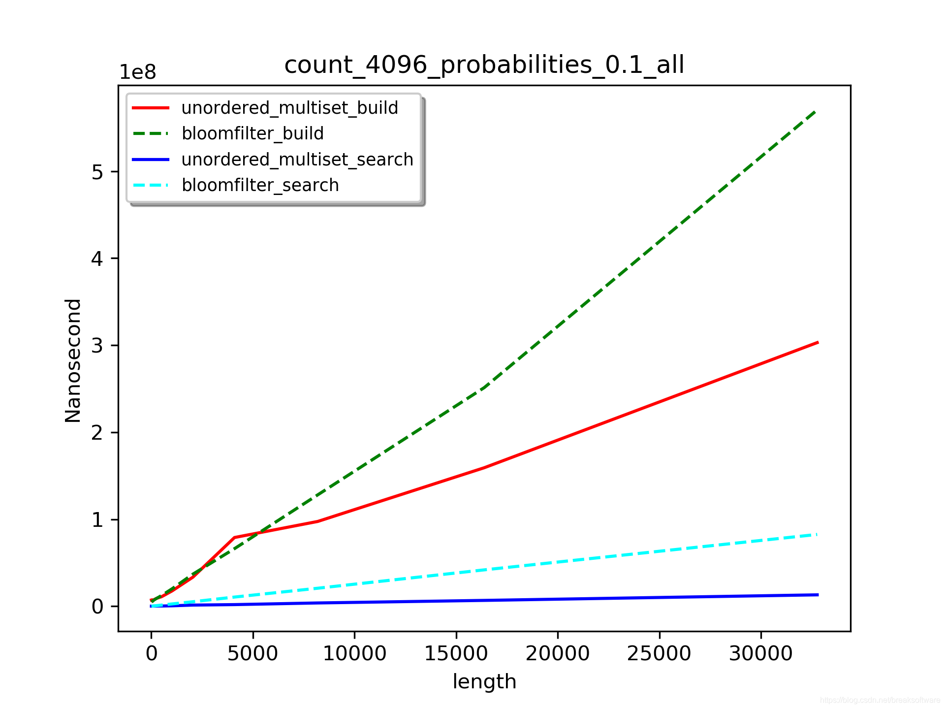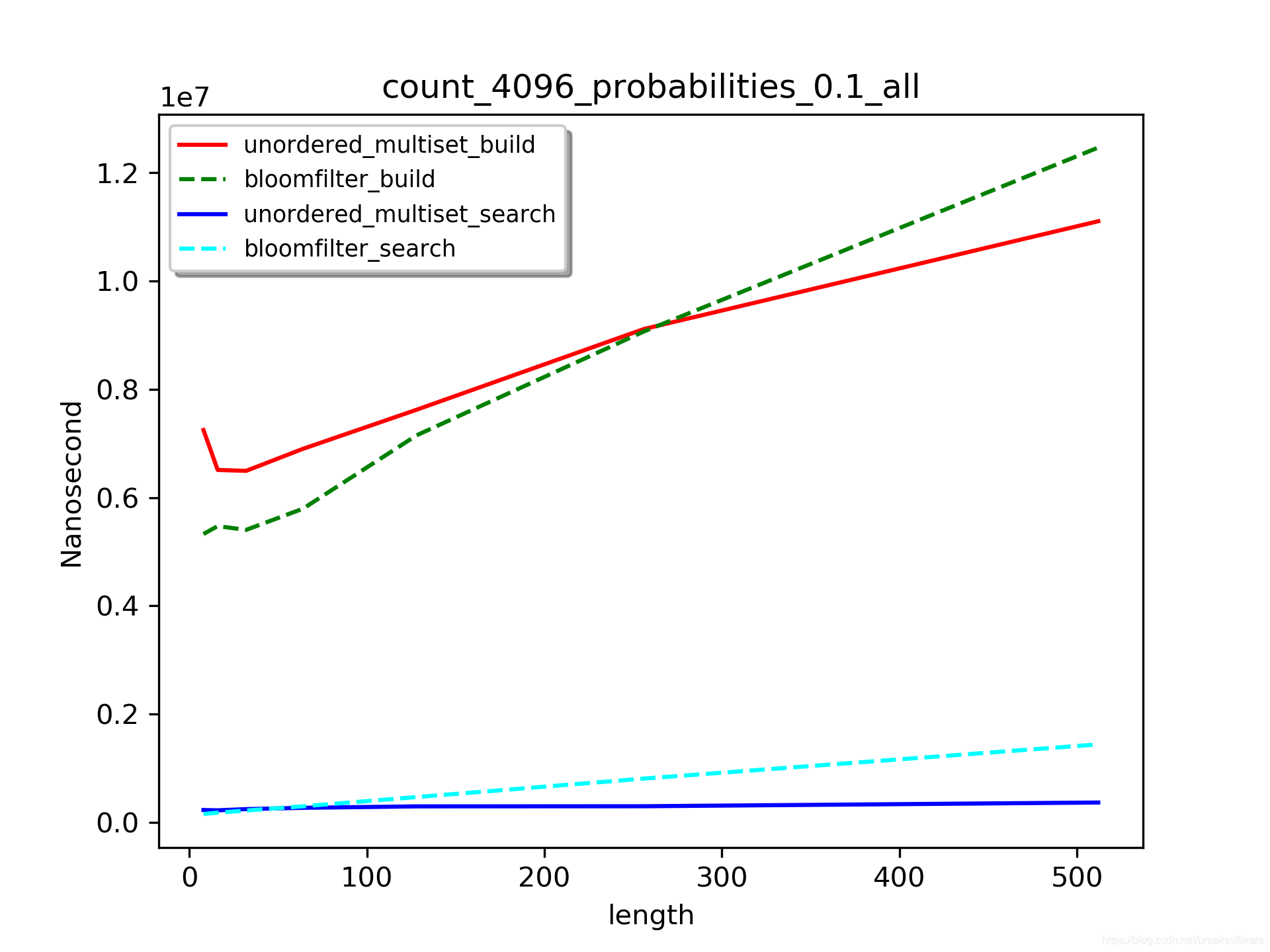 当数据长度小于500时,bloomfilter比unordered_multiset构建时间要短。但是随着数据长度的增长,前者将花费更多的时间。也就是说unordered_multiset和bloomfilter的构建时间都符合线性增长规律,但是unordered_multiset初始耗时