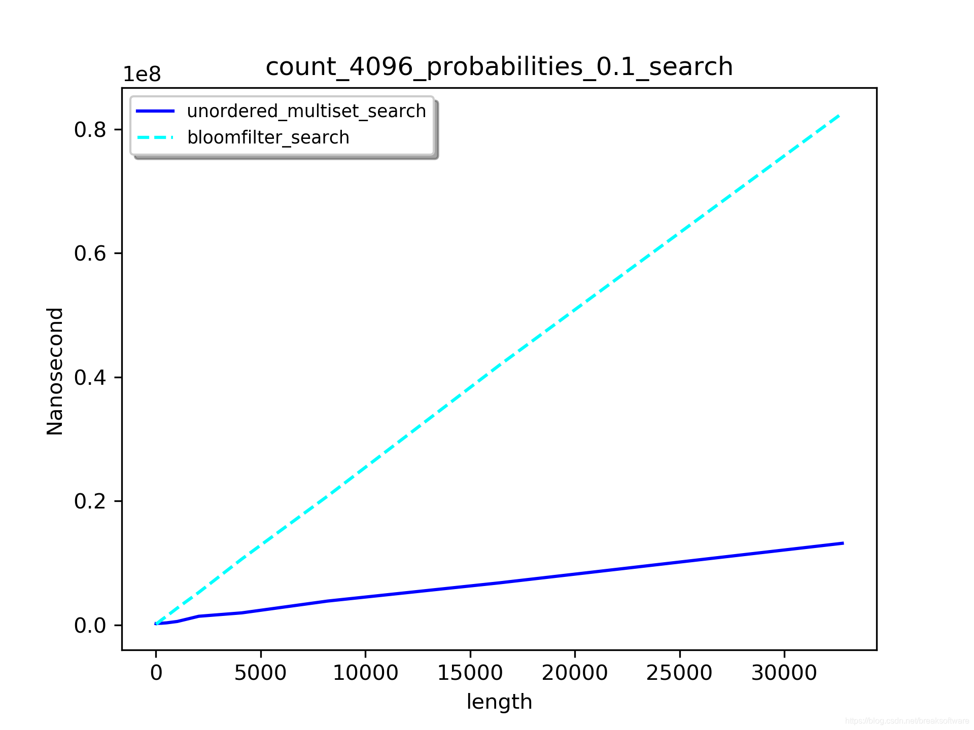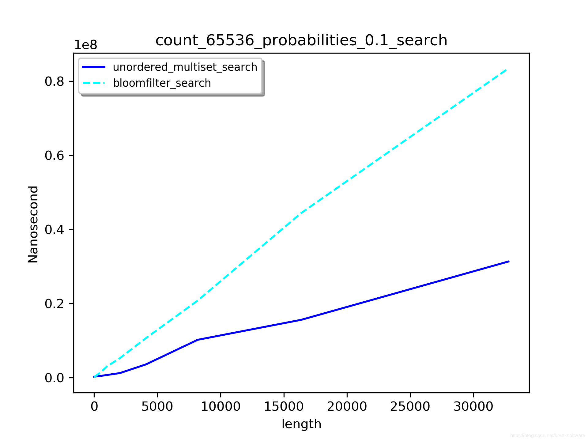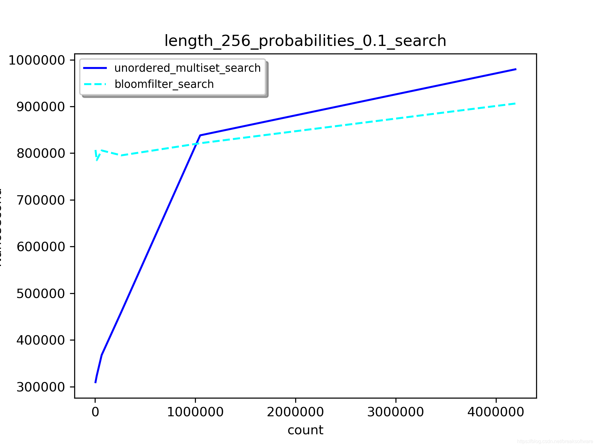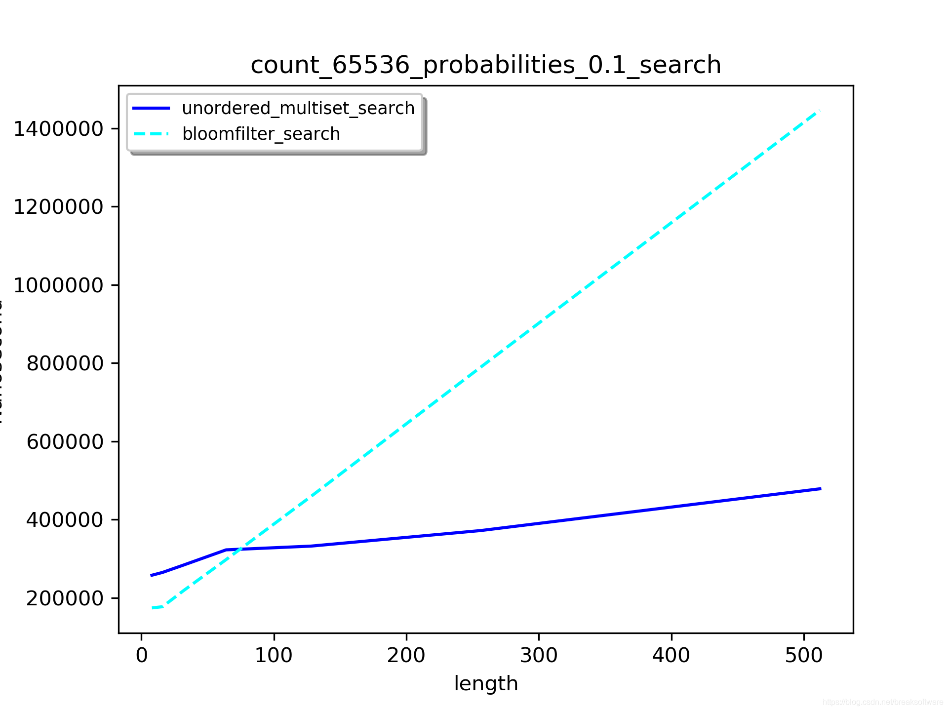 当数据长度小于500时,bloomfilter比unordered_multiset构建时间要短。但是随着数据长度的增长,前者将花费更多的时间。也就是说unordered_multiset和bloomfilter的构建时间都符合线性增长规律,但是unordered_multiset初始耗时