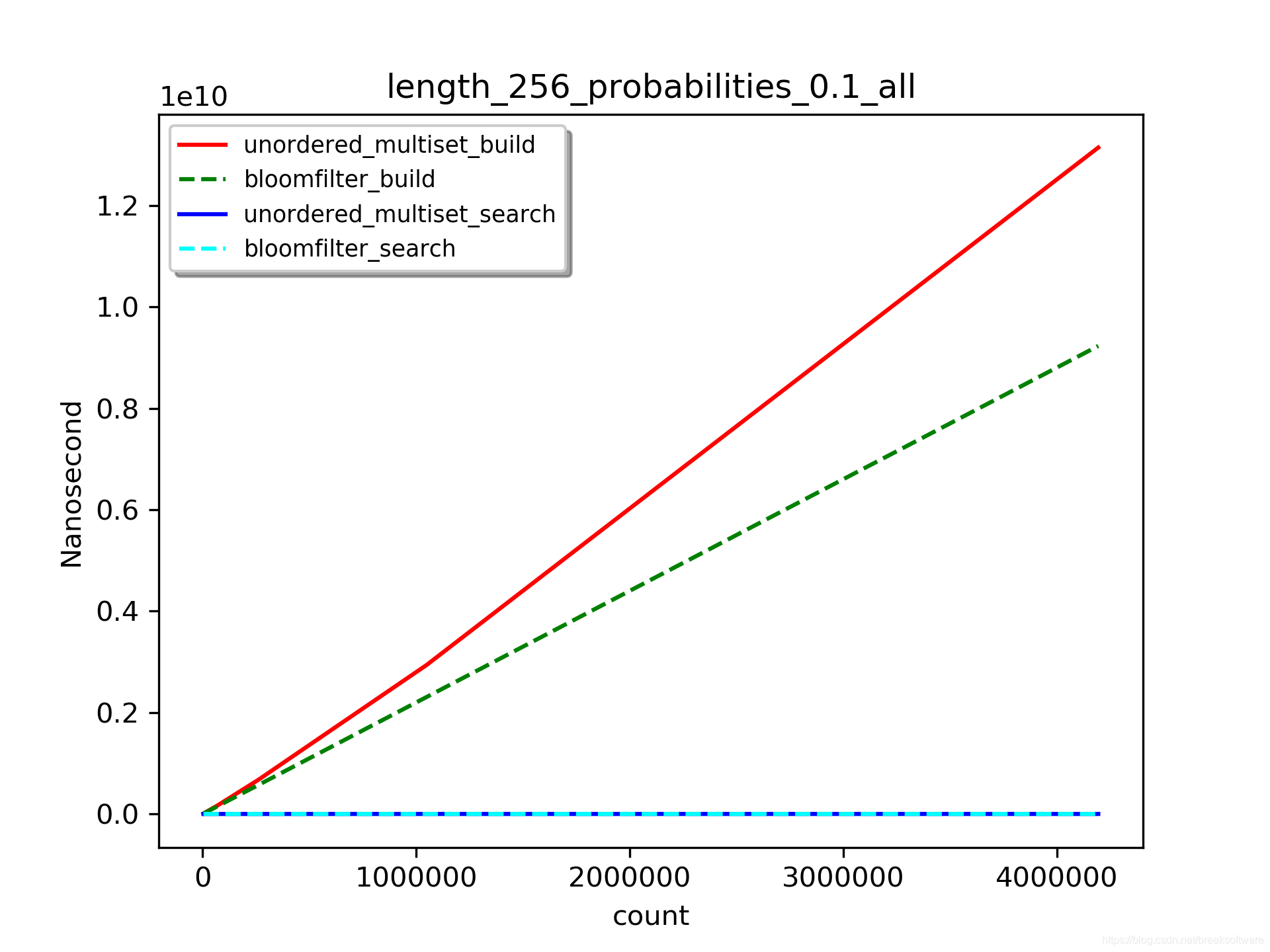 在数据长度(256)和误算率(0.1)确定的情况下,我们比较不同集合大小时,unordered_multiset、bloomfilter的构建,和它们查找1024个不存在的元素的时间消耗。