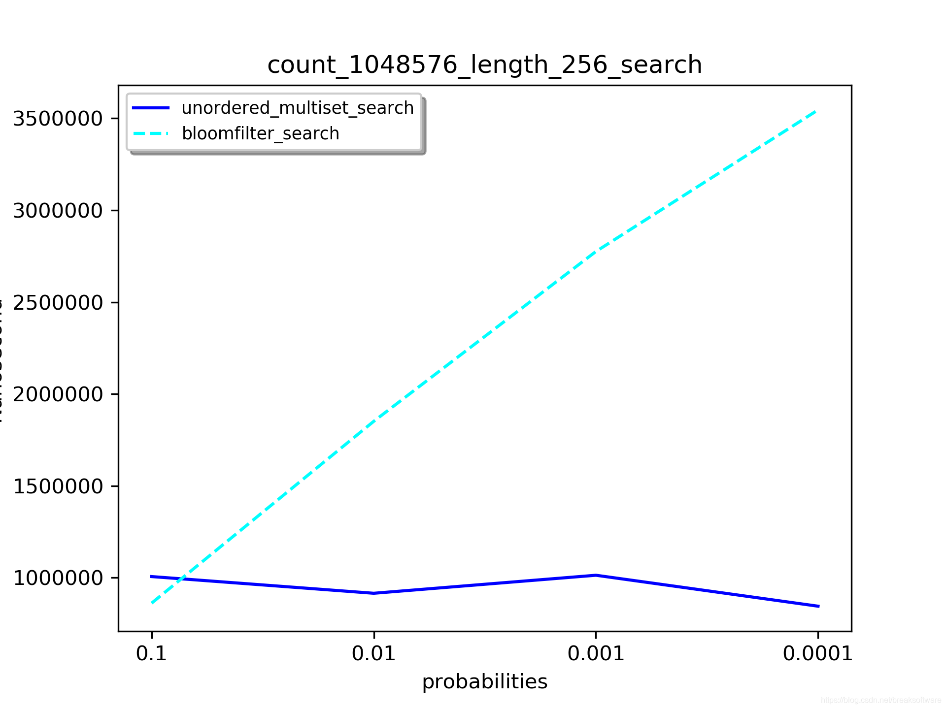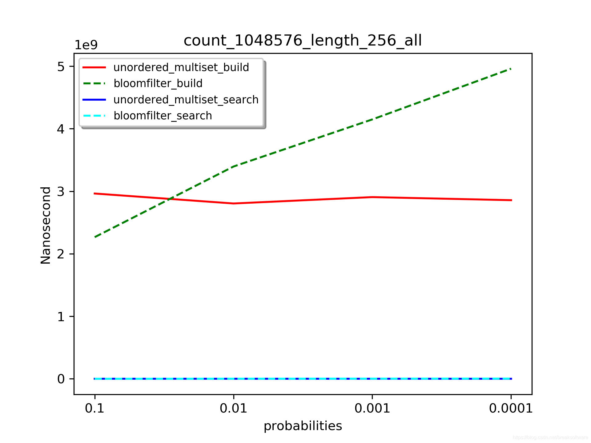 因为unordered_multiset和误算率没有关系,而且数据长度和集合大小固定,所以它几乎是条直线。但是我们看到随着误算率的降低,bloomfilter的构建速度也在变慢。