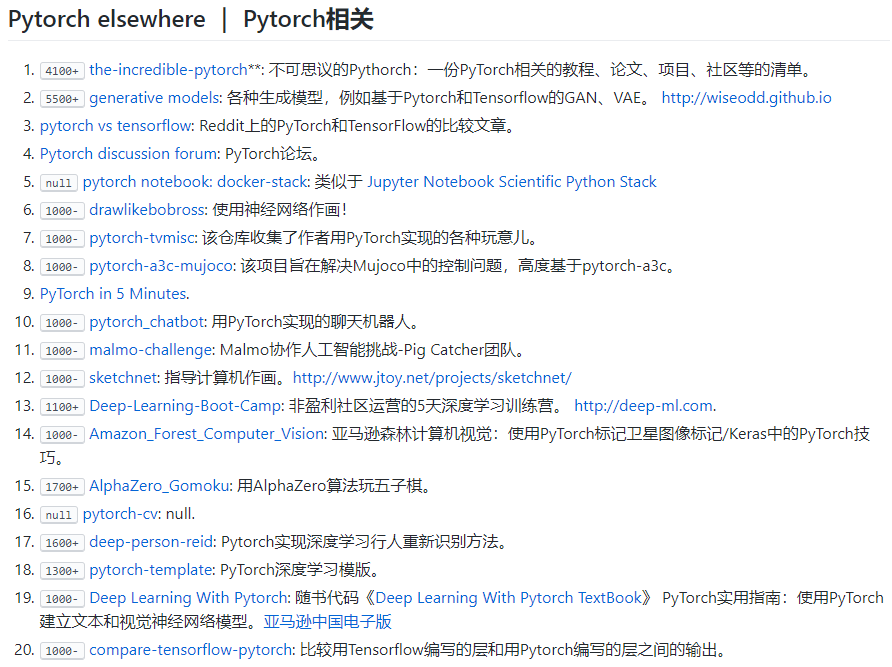总的来说,这是一份超赞的 PyTorch 资源大列表,非常全面。而且对原项目进行了翻译。值得推荐!