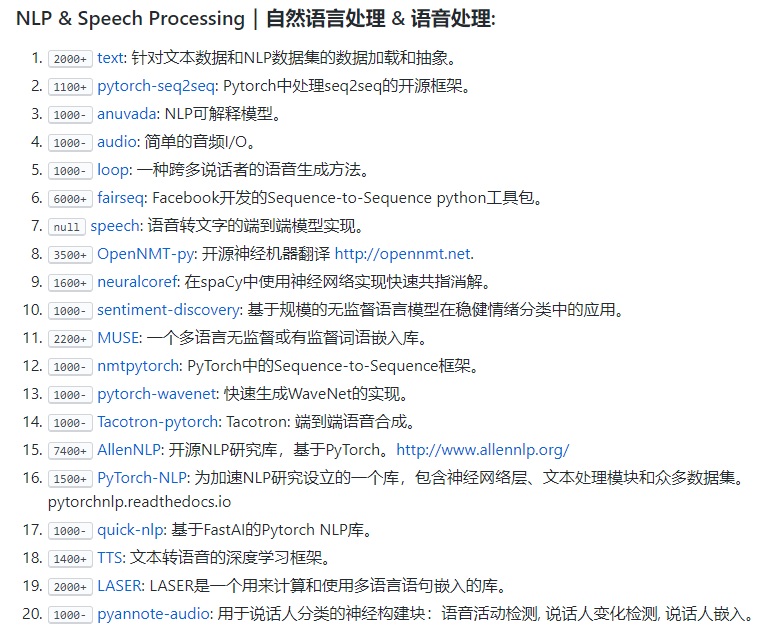 这部分包含了 41 个 PyTorch NLP 相关的热门项目,例如一种跨多说话者的语音生成方法、语音转文字的端到端模型实现、快速生成WaveNet的实现;PyTorch NLP 相关的热门库,例如基于 FastAI 的 Pytorch NLP 库、用来计算和使用多语言语句嵌入的库 LASER;PyTorch NLP 相关的热门框架和工具,例如pytorch-seq2seq、PyTorch 中的 Sequence-to-Sequence 框架 nmtpytorch等等。