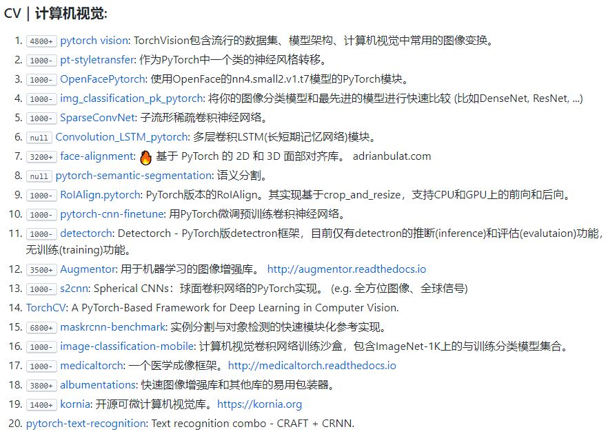 这部分包含了 25 个 PyTorch CV 相关的热门项目和库。例如包含流行的数据集、模型架构、计算机视觉中常用的图像变换的 TorchVision,用于机器学习的图像增强库 Augmentor,实例分割与对象检测的快速模块化参考实现 maskrcnn-benchmark,基于 PyTorch 的 2D 和 3D 面部对齐库 ace-alignment 等等。