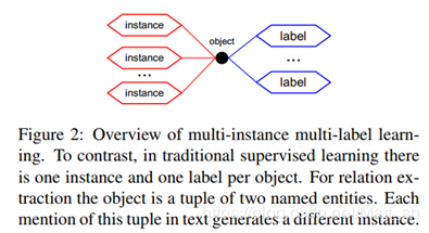 这篇文章主要是解决远程监督论文所提到的第一个问题。实体间不止存在一种关系,比如中国-北京。可能是北京在中国,也可能北京是中国首都,也可能是北京面积比中国小。也就是不同句子,可以提取出同一实体,表达不同关系。所以,作者提出用多示例多标签学习来解决这一问题。