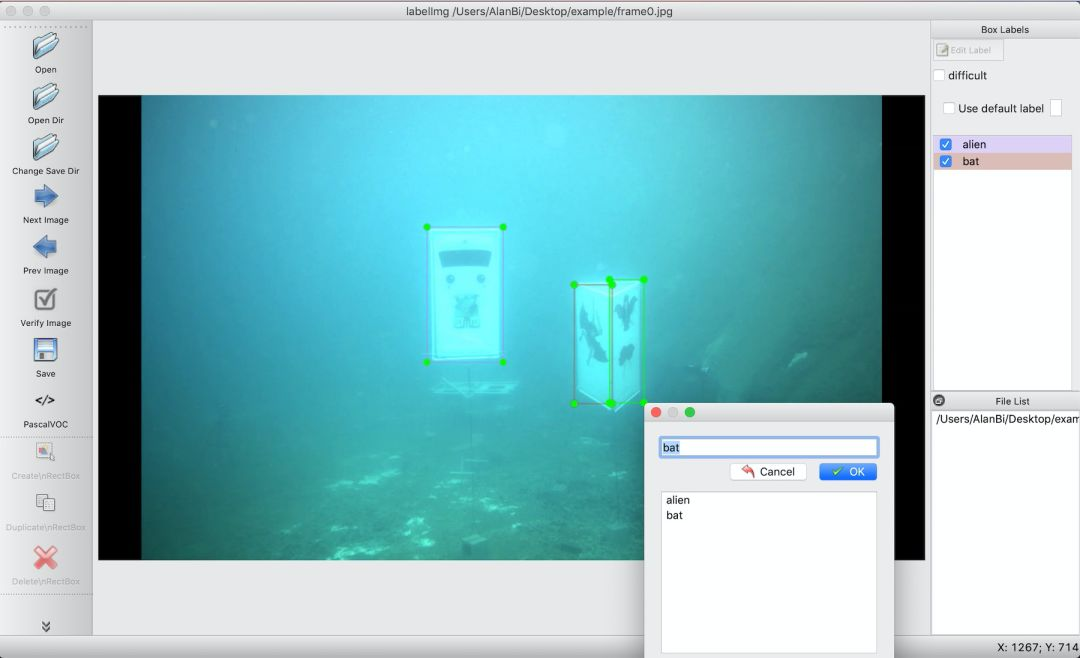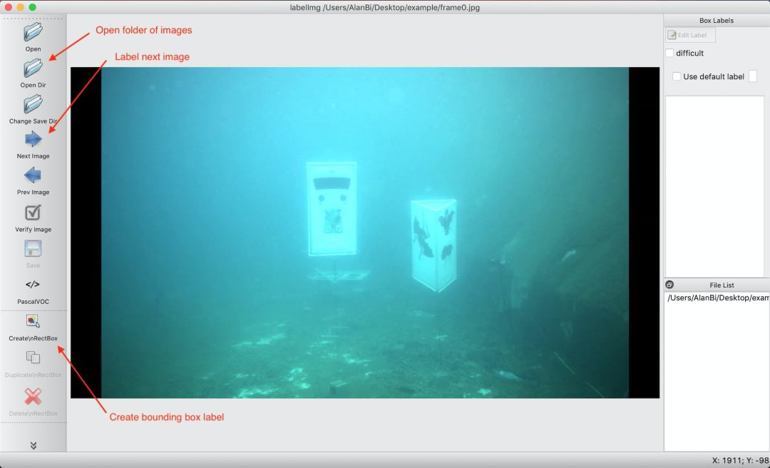 现在是耗时的部分:标记。Detecto支持PASCAL VOC格式,其中具有XML文件,其中包含图像中每个对象的标签和位置数据。要创建这些XML文件,可以使用开源LabelImg工具,如下所示: