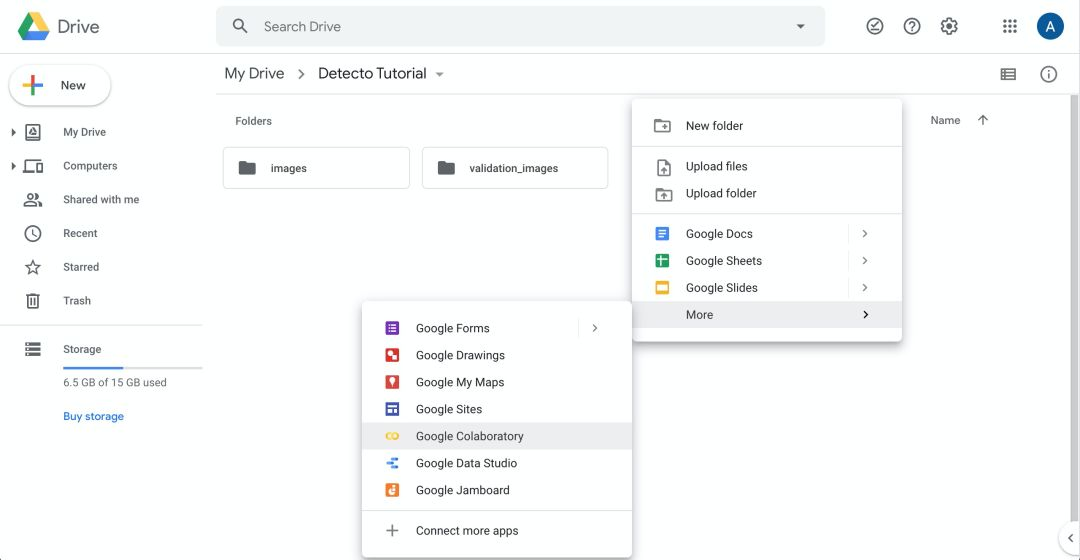 4)右键单击,转到“更多”,然后单击“Google Colaboratory”: