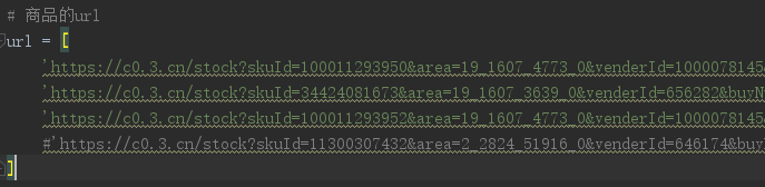 url = ['https://c0.3.cn/stock?skuId=100011293950&area=19_1607_4773_0&venderId=1000078145&buyNum=1&choseSuitSkuIds=&cat=9192,12190,1517&extraParam={%22originid%22:%221%22}&fqsp=0&pdpin=&pduid=1580214678781491106132&ch=1&callback=jQuery4173314','https://c0.3.cn/stock?skuId=34424081673&area=19_1607_3639_0&venderId=656282&buyNum=1&choseSuitSkuIds=&cat=9192,12190,1517&extraParam={%22originid%22:%221%22}&fqsp=0&pdpin=&pduid=1580214678781491106132&ch=1&callback=jQuery7815511','https://c0.3.cn/stock?skuId=14567560031&area=6_318_320_44149&venderId=70651&buyNum=1&choseSuitSkuIds=&cat=9847,13533,13534&extraParam={%22originid%22:%221%22}&fqsp=0&pdpin=&pduid=1580535906442142991701&ch=1&callback=jQuery660434','https://c0.3.cn/stock?skuId=100011293952&area=19_1607_4773_0&venderId=1000078145&buyNum=1&choseSuitSkuIds=&cat=9192,12190,1517&extraParam={%22originid%22:%221%22}&fqsp=0&pdpin=&pduid=1580214678781491106132&ch=1&callback=jQuery5497502','https://c0.3.cn/stock?skuId=11300307432&area=2_2824_51916_0&venderId=646174&buyNum=1&choseSuitSkuIds=&cat=9192,12190,1517&extraParam={%22originid%22:%221%22}&fqsp=0&pdpin=&pduid=1580214678781491106132&ch=1&callback=jQuery4188953',