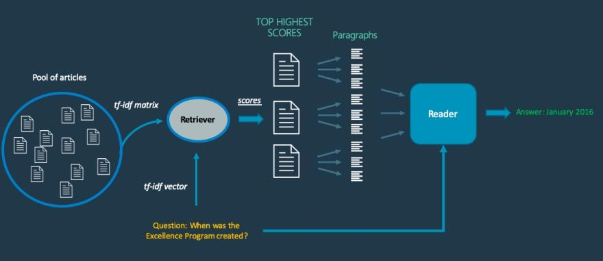 在选择了最可能的文档后,系统将每个文档分成几个段落,并将问题一起发送给读者,这基本上是一个预先训练好的深度学习模型。所使用的模型是著名的NLP模型BERT的Pytorch 版本。
