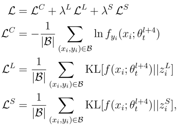 它的长期老师来自于上一个子训练过程最后一个训练周期(即第l+2个训练周期)中(xi,yi)被选中时的网络参数。假设(xi,yi)在第w步被随机挑选作为训练样本,则其长期老师为此时刻网络对它预测的概率分布: