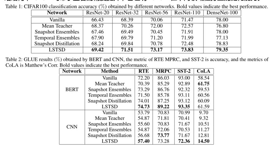 另一方面,每一个样本的老师信号都来自于不同的历史训练时刻,因此在训练的每个时刻,模型都是同时向多个历史时刻的模型学习,集百家之所长,从而得到更好的训练效果。我们在自然语言处理和计算机视觉的多个任务上进行了实验,实验结果证明我们提出的LSTSD的有效性。