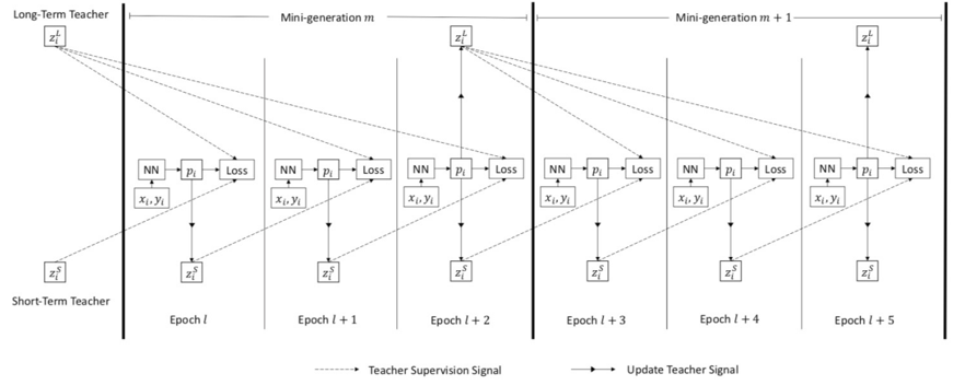 如上图,首先我们将整个训练过程分为多个子训练过程(mini-generation),每个子训练过程包含若干个训练周期(epoch),每个训练周期中每个样本会随机被挑选一次作为训练样本更新网络参数。每个样本的长期老师来自于上一个子训练过程的最后一个训练周期,短期老师来自于上一个训练周期。