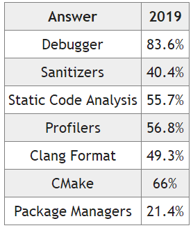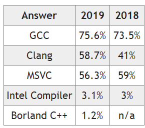 还有一项来自Jetbrains的调查:C++ 2019 - 2019信息图表中开发者生态系统状态调查(https://www.jetbrains.com/lp/devecosystem-2019/cpp/)