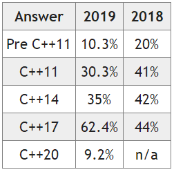 这份问卷调查表和结果可以在这里找到:第二次C++基金会年度开发者问卷调查:标准C++ (https://www.jetbrains.com/lp/devecosystem-2019/cpp/)