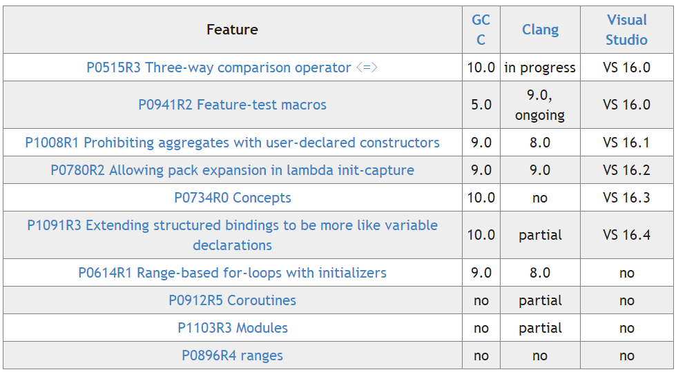 像以往一样,完整的编译器支持列表可以在cppreference网站:C++20编译器支持页面(https://en.cppreference.com/w/cpp/compiler_support#cpp2a)上找到。但是我想在这里列举几个: