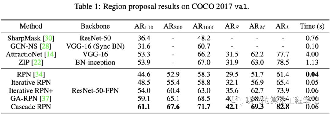Region Proposal Performance.Table1展示了Cascade RPN与state-of-the-art的RPN研究对比,其中Sharp Mask,GCN-NS,AttractionNet,ZIP结果直接从原文里获取,其余用mmdetection复现。Cascade RPN比原始的RPN提升了13.4%AR,由于遵守了对齐规则,Cascade RPN比其它的方法性能都要优异