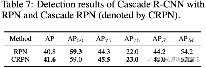 Extension with Cascade R-CNN. 在Cascade R-CNN上,Cascade RPN能提升0.8%AP