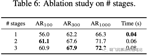 Number of Stages. Table6展示了stage数量对结果的影响,可以看到2-stage和3-stage性能几乎一样,2-stage是个不错的选择