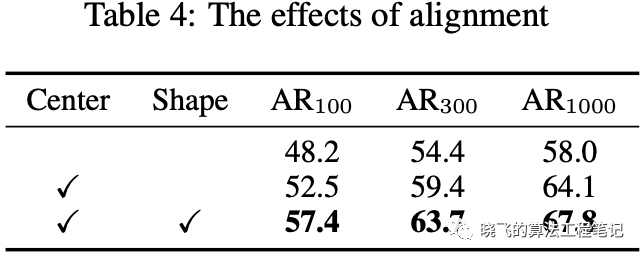Acquisition of Alignment. 为了研究自适应卷积的性能,进行了Table4实验。从结果可以看出,当仅使用中心偏移时,提升6.1%AR,而当使用中心和形状偏移时,性能达到67.8%