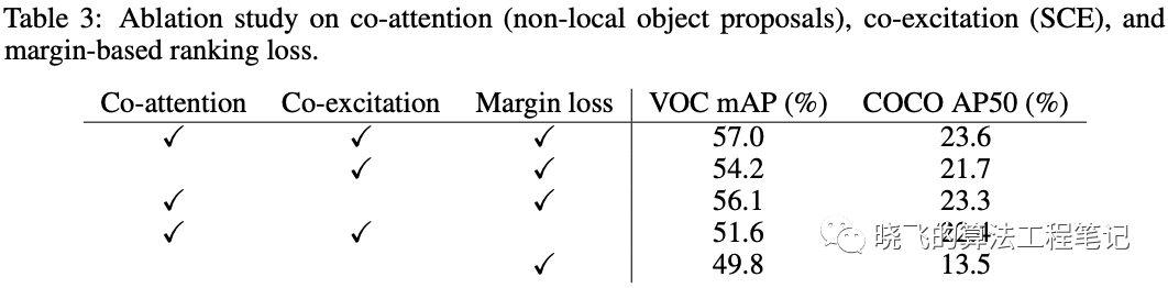 论文研究了不同的策略的共享,如Table3。首先,不使用Co-attention和Co-excitation的模型表现最差,而分别单独加入non-local RPN和SCE在VOC和COCO上能分别能带来6.3/4.4mAP和9.8/8.2AP(%)提升,同时加入则分别进一步带来0.9/1.8mAP(%)和0.3/1.9AP(%)提升,这意味着co-attention和co-exciation对性能表现都很关键,而margin-based ranking loss也是很重要的。