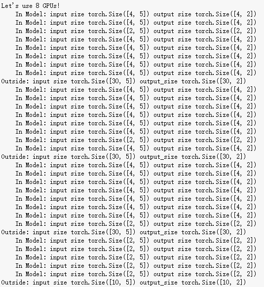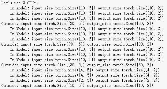 Outside: input size torch.Size([30, 5]) output_size torch.Size([30, 2])In Model: input size torch.Size([10, 5]) output size torch.Size([10, 2])