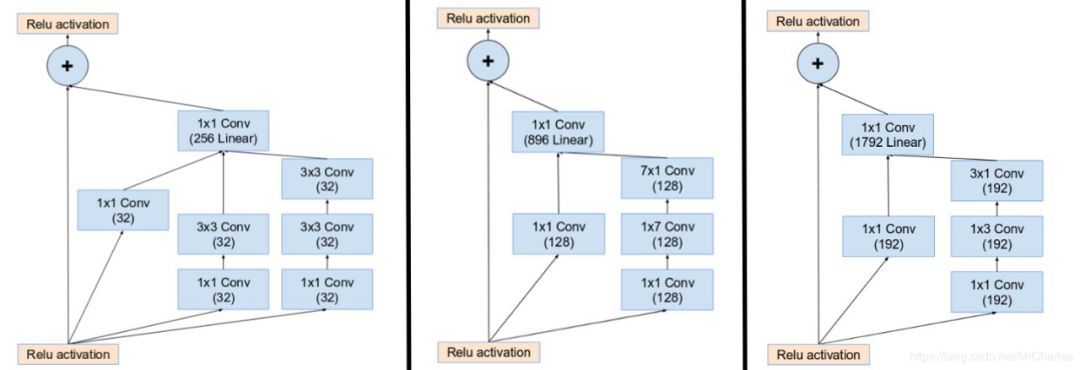 总体而言,就是引入 residual connections ,这些 residual connections 将 inception module的卷积运算的输出添加到输入中。为了进行residual addition 运算,卷积后的输入和输出必须具有相同的尺寸。因此,我们在原始卷积之后使用1x1卷积,以匹配深度大小(卷积后深度增加)。