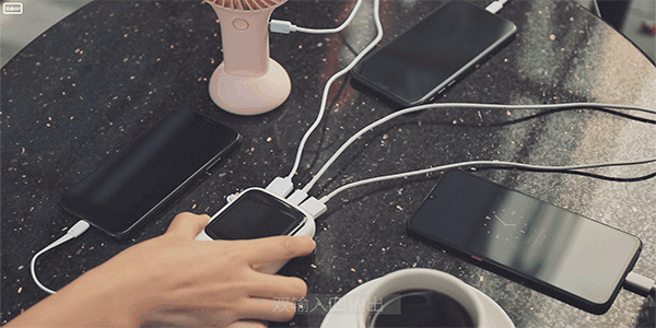 值得一提的是,移动电源拥有2个USB插口,一个Type-C插口,一个苹果插口,加上机身还有一条充电线,可以同时给4部手机充电。