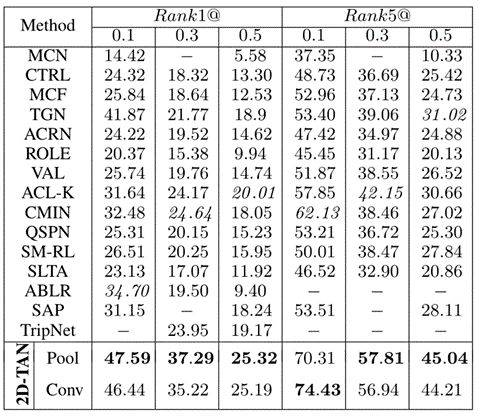 1.Songyang Zhang, Houwen Peng, JianlongFu and Jiebo Luo, “Learning 2D Temporal Adjacent Networks forMoment Localization with Natural Language”, AAAI 2020