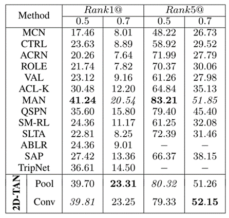 表1:Charades-STA的实验结果。Pool和Conv表示两种不同的片段特征提取方式,下表同。