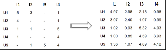 基于矩阵分解的矩阵补全因其具有较好的预测精度和较高的可扩展性,在实际推荐系统中得到了广泛的应用。目前,研究人员设计了诸多基于矩阵分解的矩阵补全和预测算法,例如SVD、非负矩阵分解(Non-negative Matrix Factorization,NMF)、概率化矩阵分解(Probabilistic Matrix Factorization,PMF)、最大间隔矩阵分解(Maximum Margin Matrix Factorization,MMMF),等等。图8.8所示为使用NMF对原始矩阵的未知值进行预测的结果。