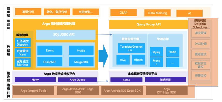 作为免费用户数据中台,Argo帮助初创企业和创新团队建立自己的用户行为中台,完成业务分析部分,但是大的企业有自己的大数据平台,直接如何方便互联互通。这个情况非常复杂,很难通过一家企业来完成所有的生态,易观的思路是开源,共享共建。大数据平台中的核心ETL调度组件,易观3月份正式开源了分布式易扩展的可视化DAG工作流任务调度系统Dolphin Scheduler,在众多用户期待和全球技术专家投标的肯定下,8月底正式加入Apache孵化器,成为国内唯一的一家Apache大数据调度引擎,10月底A10峰会上,易观正式开源了“可视化埋点SDK”,旨在帮助企业解决数据埋点这个痛点。