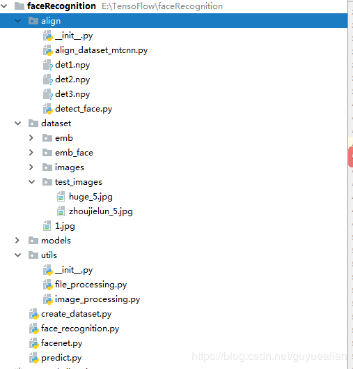 align:这个文件夹是从facenet中拷贝的,https://github.com/davidsandberg/facenet/tree/master/src/align,主要是MTCNN人脸检测的相关文件