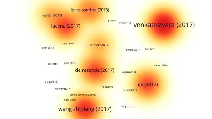 使用 VosViewer 进行的共引分析显示迁移学习相关知识集中在 3 个集群上,可以看到和时间有着很大的关系,可以视为几波波浪:第一波浪潮包含 2011 年之前的出版物(模式是 2006 年),图5 中以黄色显示;第二波浪潮从 2011 年到 2014 年(2012 年模式)为红色;第三波,也是最后一波,图中的绿色表示从 2012 年至今的文章(2014 模式)。