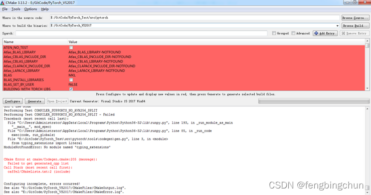 在Windows下通过cmake-gui.exe生成不带cuda的Torch.sln工程操作步骤:PyTorch版本使用1.8.1。首先可以先通过打开cmake-gui.exe,指定pytorch源代码目录和生成vs2017工程的位置;然后点击Configure,选中”Visual Studio 15 2017 Win6…