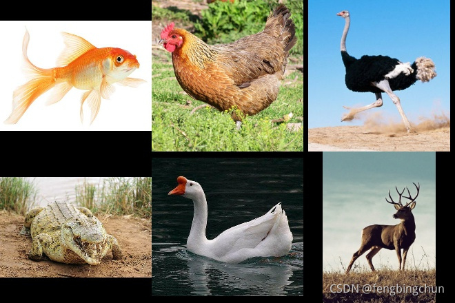 model.eval() # AlexNet is required to be put in evaluation mode in order to do prediction/evaluationwith open("imagenet_classes.txt") as f:classes = [line.strip() for line in f.readlines()] # the line number specified the class numberfor x in range(len(tensor_data)):prediction = model(tensor_data[x])#print(prediction.shape) # [1,1000]_, index = torch.max(prediction, 1)percentage = torch.nn.functional.softmax(prediction, dim=1)[0] * 100print(f"result: {classes[index[0]]}, {percentage[index[0]].item()}")print("test finish")执行结果如下:以下原始测试图像来自网络,每张图像仅输出可信度值最高的一个类别。从上往下,从左往右,每张图像的分类结果依次是:goldfish(金鱼)、hen(母鸡)、ostrich(鸵鸟)、African crocodile(非洲鳄鱼)、goose(鹅)、hartebeest(羚羊)。