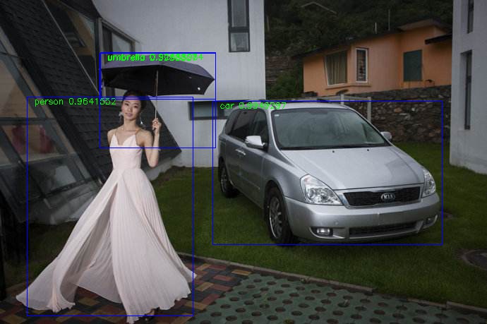 #print(predictions)coco_labels_name = ["unlabeled", "person", "bicycle", "car", "motorcycle", "airplane", "bus", "train", "truck", "boat","traffic light", "fire hydrant", "street sign", "stop sign", "parking meter", "bench", "bird", "cat", "dog", "horse","sheep", "cow", "elephant", "bear", "zebra", "giraffe", "hat", "backpack", "umbrella", "shoe","eye glasses", "handbag", "tie", "suitcase", "frisbee", "skis", "snowboard", "sports_ball", "kite", "baseball bat","baseball glove", "skateboard", "surfboard", "tennis racket", "bottle", "plate", "wine glass", "cup", "fork", "knife","spoon", "bowl", "banana", "apple", "sandwich", "orange", "broccoli", "carrot", "hot_dog", "pizza","donut", "cake", "chair", "couch", "potted plant", "bed", "mirror", "dining table", "window", "desk","toilet", "door", "tv", "laptop", "mouse", "remote", "keyboard", "cell phone", "microwave", "oven","toaster", "sink", "refrigerator", "blender", "book", "clock", "vase", "scissors", "teddy bear", "hair drier","toothbrush", "hair brush"] # len = 92for x in range(len(predictions)):pred = predictions[x]scores = pred["scores"]mask = scores > 0.5 # 只取scores值大于0.5的部分boxes = pred["boxes"][mask].int().detach().numpy() # [x1, y1, x2, y2]labels = pred["labels"][mask]scores = scores[mask]print(f"prediction: boxes:{boxes}, labels:{labels}, scores:{scores}")img = images_data[x]for idx in range(len(boxes)):cv2.rectangle(img, (boxes[idx][0], boxes[idx][1]), (boxes[idx][2], boxes[idx][3]), (255, 0, 0))cv2.putText(img, coco_labels_name[labels[idx]]+" "+str(scores[idx].detach().numpy()), (boxes[idx][0]+10, boxes[idx][1]+10), cv2.FONT_HERSHEY_SIMPLEX, 0.4, (0, 255, 0), 1)cv2.imshow("image", img)cv2.waitKey(1000)cv2.imwrite(images_path+"result_"+images_name[x], img)print("test finish")说明: