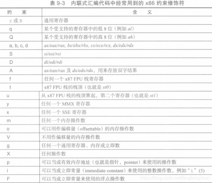 下表列出了内联式汇编代码中经常用到的x86约束修饰符:
